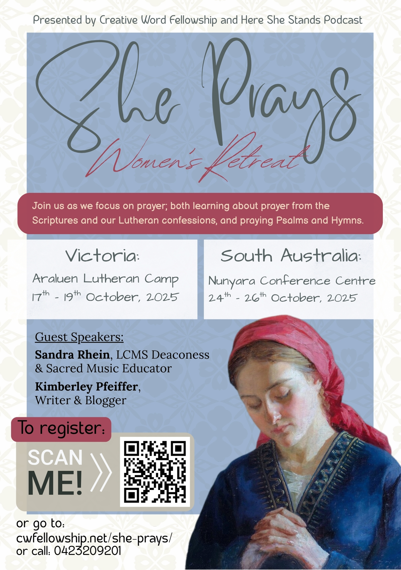 Creative Word Fellowship and Here She Stands Podcast are pleased to bring you a Women’s Retreat on prayer. ‘She Prays’ is an intergeneration event for all women aged 16 and older. Join us overnight or just for the Saturday as we learn about prayer from the Scriptures and our Lutheran Confessions, and learn to pray Psalms and hymns.